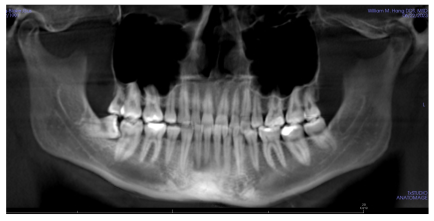 Panoramic. My LR8 (lower right 8/third molar/wisdom tooth) is mesially (towards the center line) inclined and impacted here. We’re attempting to upright it with Invisalign as of April 2026.